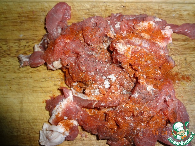 Тем временем пока наши овощи готовятся подготавливаем мясо: режем и приправляем паприкой, солью (не увлекайтесь) и душистым перцем. Отправляем тушиться и жариться мясо. Время приготовления будет зависеть от того какое вы выбрали мясо. Обжариваем его до красивой корочки.