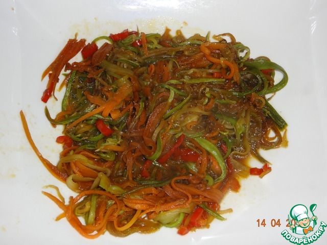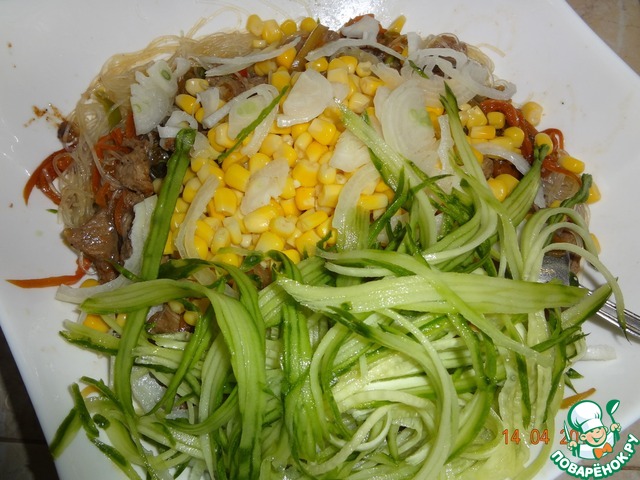 Мясо готово и мы начинаем собирать наш салатик. Итак, овощи тушеные в соевом соусе уже в салатнике, добавляем к ним фунчозу и мясо ( если осталось немного мясного сока оно и к лучшему все в салатик). Сверху кладем кукурузу, лук ( предварительно слив уксус), огурец ( его нарезаем тоненькими полосочками как морковь и кабачок и самое главное в последнюю очередь)