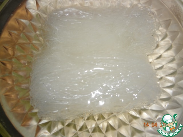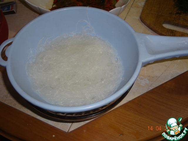 Как только чайник вскипел, заливаем нашу фунчозу на 5 минут кипятком.