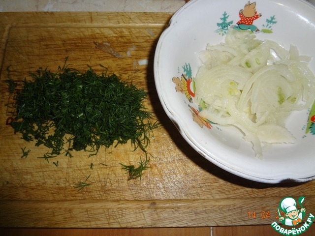 Тем временем нарезаем мелко укроп и лук тонкими полукольцами. Лучок перекладываем в тарелочку и добавляем немного уксуса 6% - он даст нам необходимую кислинку.