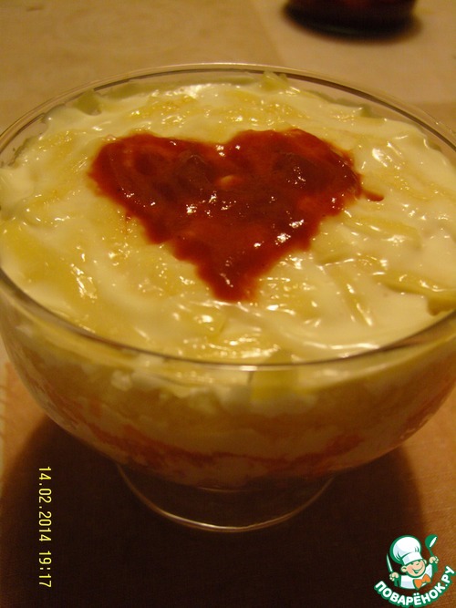 4) Яблоко натереть на терке, выложить в салатницу, смазать майонезом;