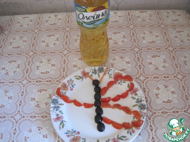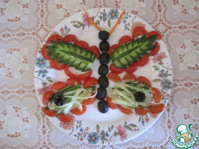 Выкладываем овощи в виде бабочки: середина из масллин крылышки из помидоров.
