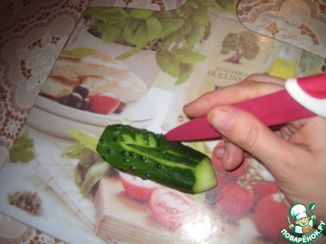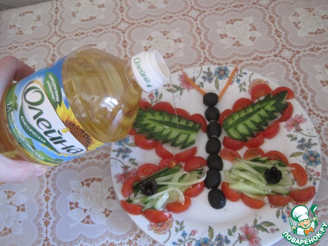Украшаем бабочку огурцами, маслинами, солим, поливаем растительным маслом.