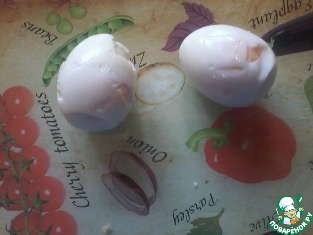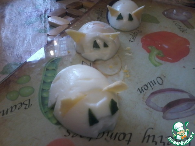 Делаем мышек. Надрезы на яйце для ушек и глаз. Последнюю половинку съедаем!!!