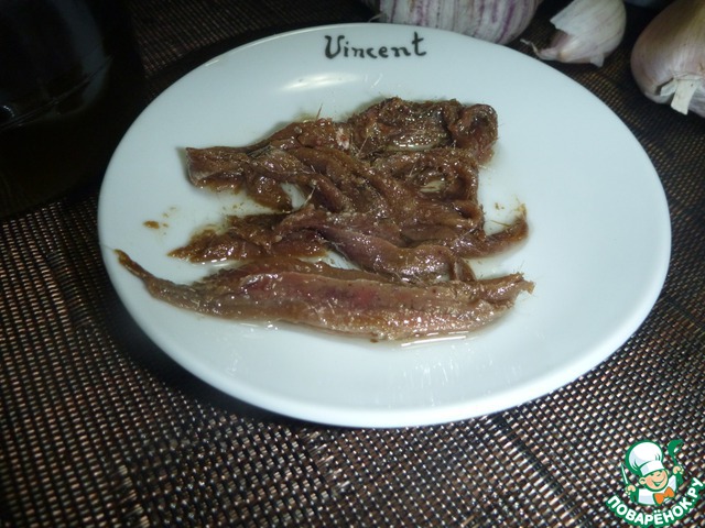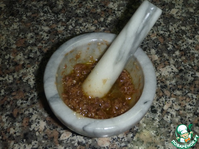 Толкем в ступке чеснок, анчоусы, в конце добавляем оливковое масло.