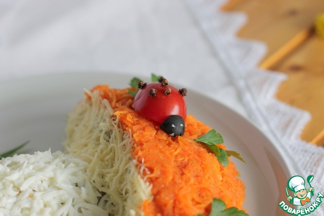 Ну, и украсим зеленью. Еще можно сделать божью коровку. Для этого берем помидорку, режем пополам. Из гвоздики делаем пятнышки, голову делаем из половинки оливки. Все, готово! Приятного аппетита!