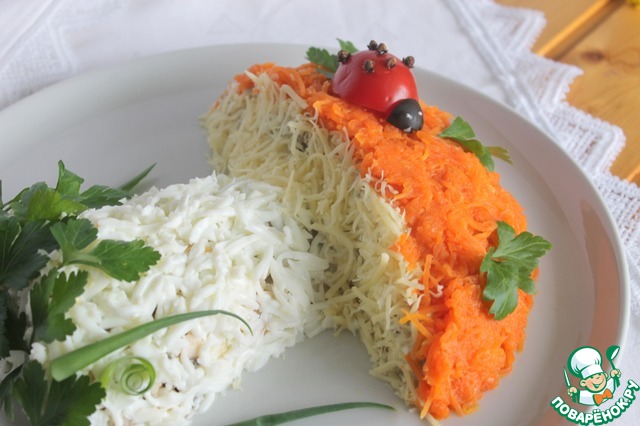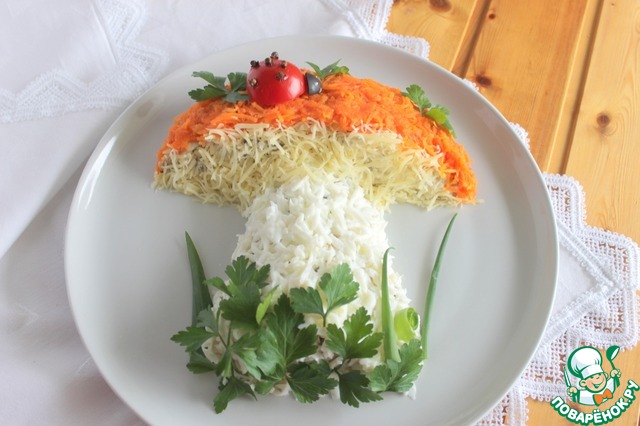 Берем большое блюдо и выкладываем салат в виде гриба. Можно нарисовать сначала майонезом контур.