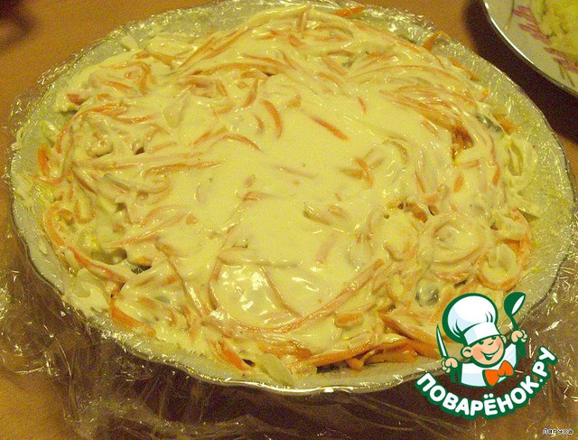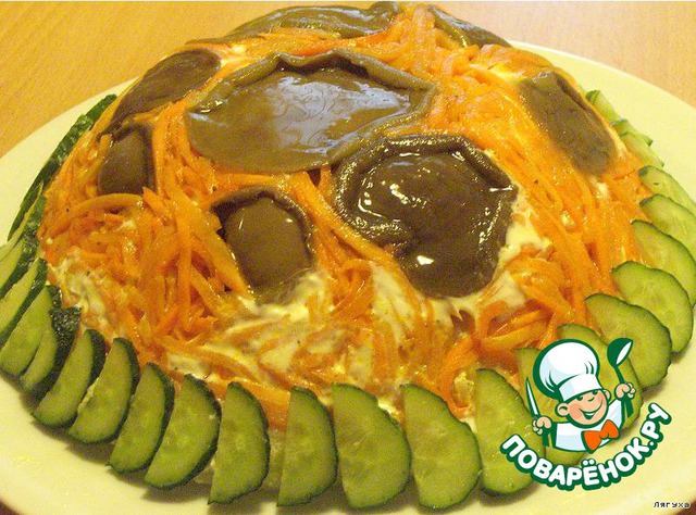 На дно укладываем шляпки грибов, а вокруг шляпок раскладываем морковь по-корейски.