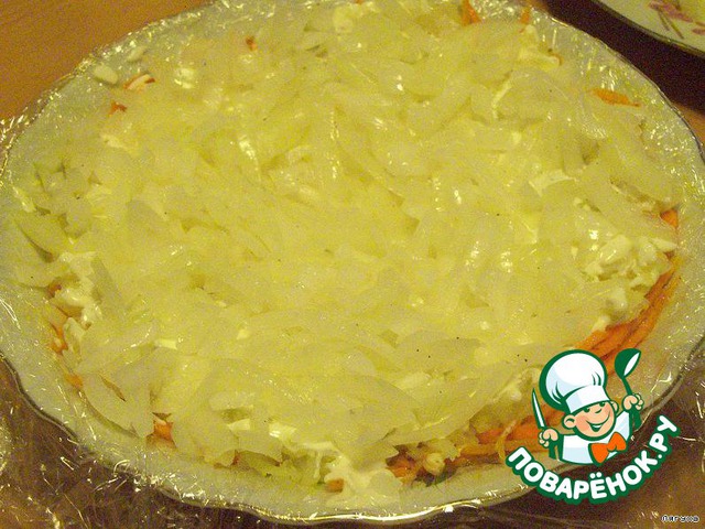 Следующий слой - маринованный лук. Его надо немного отжать перед тем, как укладывать на картофель.