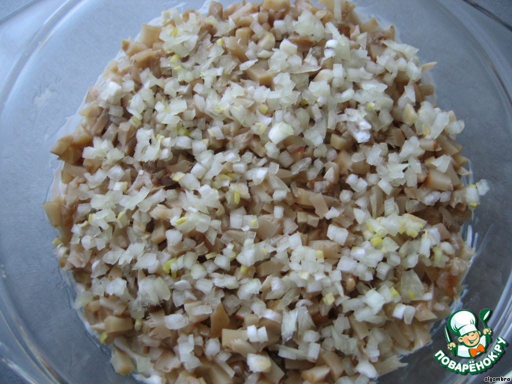 Теперь выкладываем в салатницу слой наших грибочков, а затем слой лука.