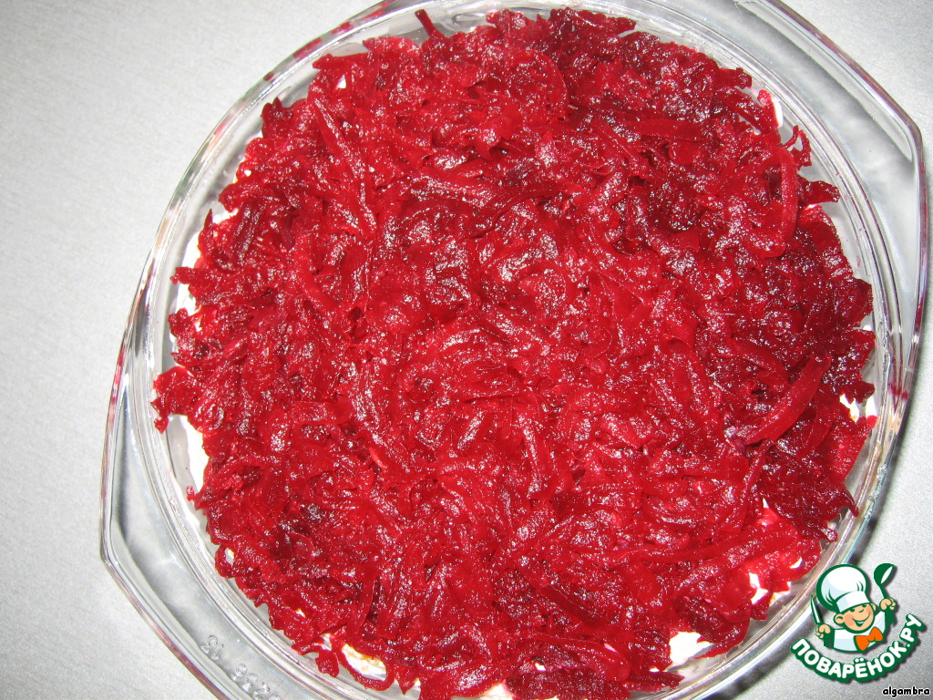 И последним слоем выкладываем очищенную и натертую тоже на крупной терке свеклу. Иногда я меняю последние два слоя местами, чтобы салатик и на вид отличался от селедки под шубой (ведь ингредиенты все те же самые) - получается очень интересный рыженький салатик - своеобразная \'Лисья шубка\'. *JOKINGLY*