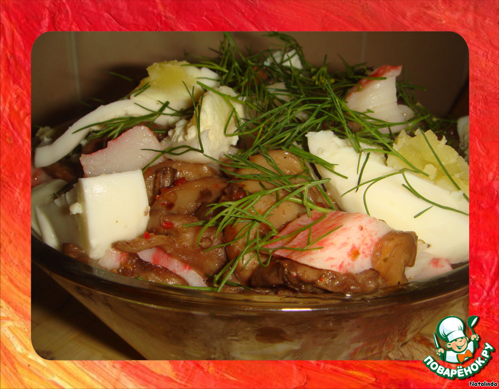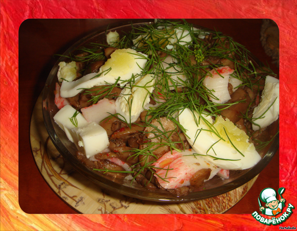 В салатник кладем в следующем порядке: грибочки с маслом, крабовые палочки, аккуратно перемешиваем, сверху укладываем дольки яиц и посыпаем укропом!