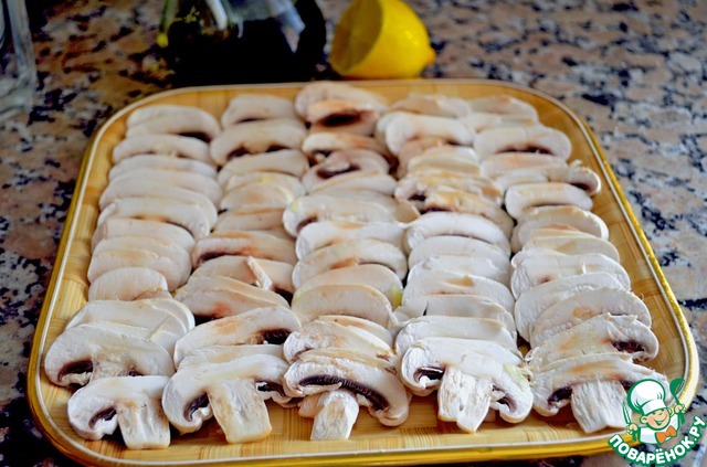Плоское блюдо сбрызнуть лимонным соком. Грибы вымыть, высушить, тонко порезать на пластики. Выложить на блюдо с нахлестом и сверху опять сбрызнуть лимонным соком.