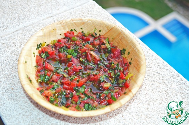 Базилик, помидор, перчик (очищенный от семян) мелко порубить. Смешать уксус с оливковым маслом. Полить смесью рубленые овощи, добавить соль и перец. Хорошо перемешать.