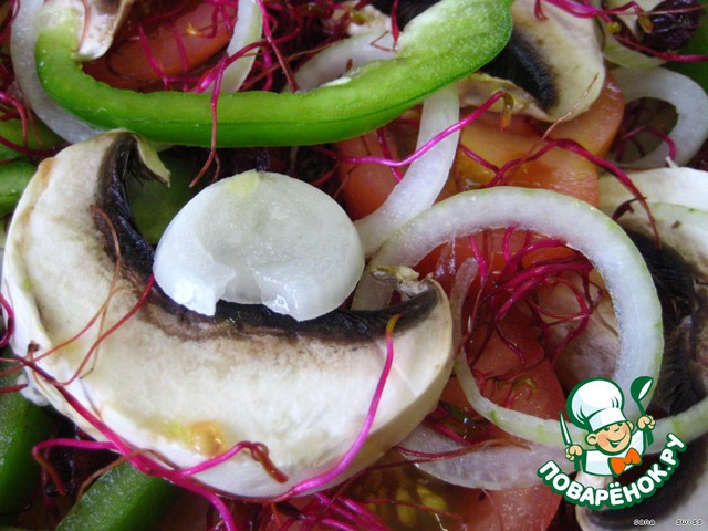 Сверху - тонкие полукольца очищенного салатного перца и проростки.