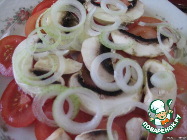 Помидоры и шампиньоны нарезать крупно и тонко по длине;