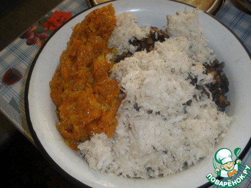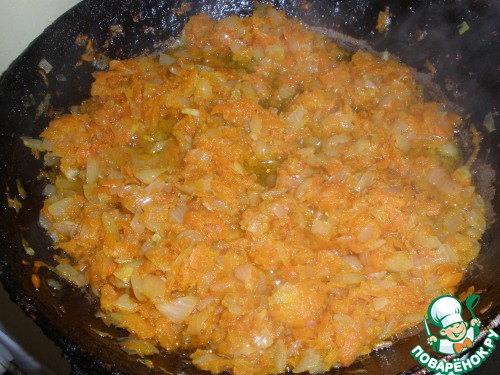 Затем также на крупн. теркe натираем морковь. Режем лук. Наливаем на сковороду подсолнечное масло. После того, как масло хорошо прогрелось, выкладываем морковь и спустя минут 5 добавляем туда же лук и убавляем огонь. Лук и морковь должны потомиться, сильно зажаривать их не следует. Можно прикрыть сковороду крышкой.