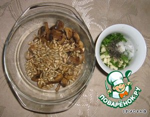 Шампиньоны сбрызнуть 1 ст.л. сока лимона и обжарить на сливочном масле 3-5 мин. Семечки смешать с грибами. Для заправки петрушку помыть, нарезать, добавить растительное масло, оставшийся сок лимона, посолить, поперчить и перемешать.