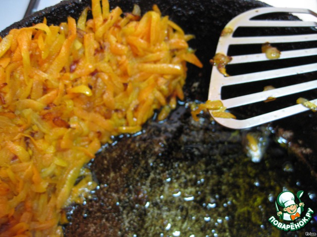 Большую морковь трем на крупной терке и обжариваем с мелко резанным луком.