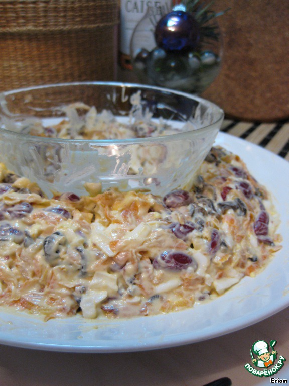 Собираем салат в миске: грибы, морковь, фасоль,