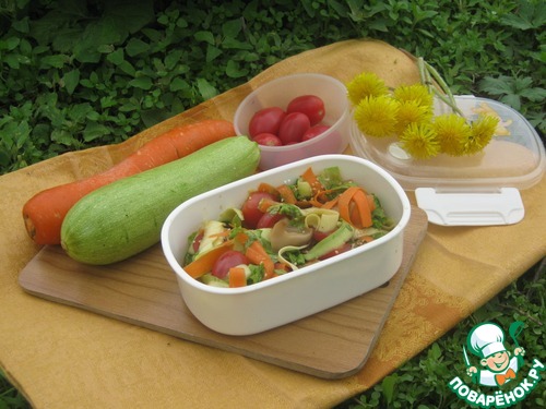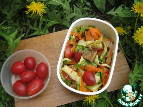 | Овощной салат с грибами, политый вкусной заправкой, отлично подойдёт к шашлыку. Приготовить его можно дома и взять с собой на пикник. |