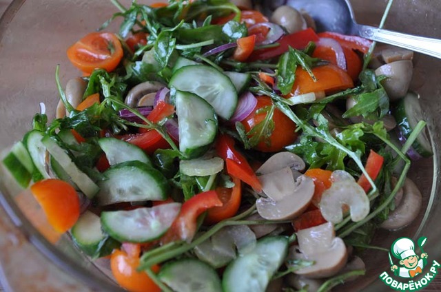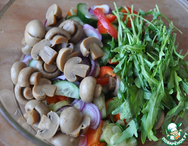 Добавляем маринованные шампиньоны (целые или нарезанные пополам в зависимости от размера), промытую и обсушенную рукколу.