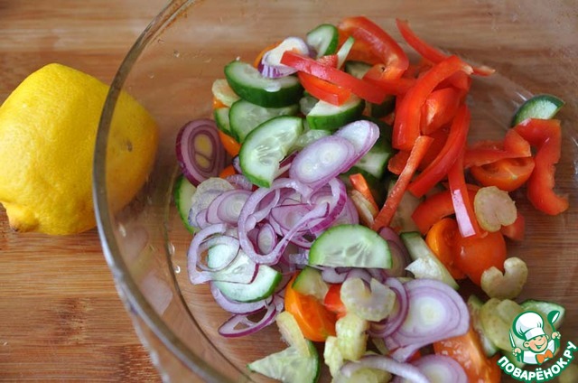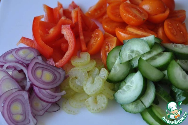 Красный лук и огурец нарезаем полукольцами, сельдерей и красный болгарский перец тонкими полосками, помидоры черри пополам или четвертинками.