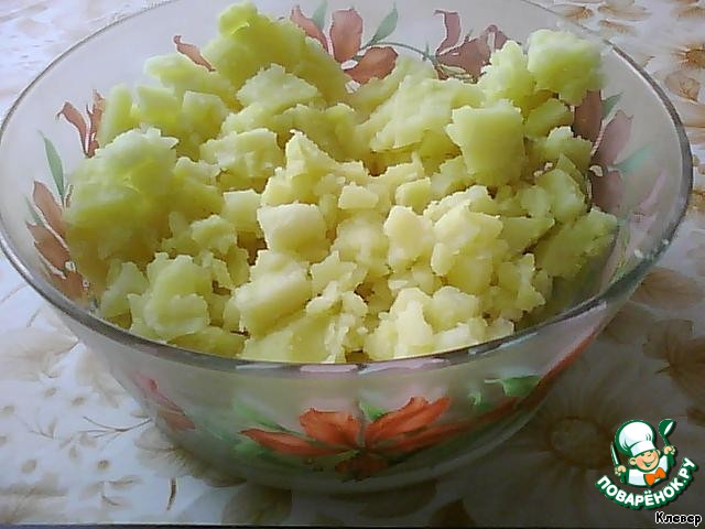 сваренный в мундире картофель очистить, нарезать кубиками,