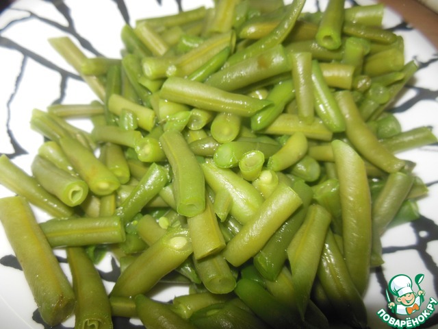 Спаржевую фасоль отварить 3 минуты в слегка солёной воде, и сразу поместить в ёмкость с холодной водой.