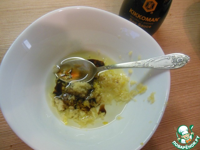 Делаем нашу заправку. Чеснок пропускаем через пресс, добавляем масло и соевый соус, перемешиваем.