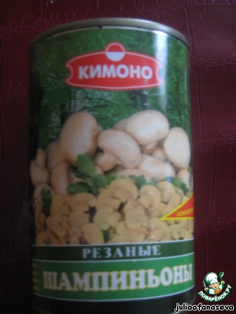 режем шампиньоны на пластинки (я беру уже нарезанные, экономлю время) и маленькими кусочками корнишоны. Если вы взяли самые мелкие (не больше 3-4 см) огурчики, то режем просто кружками, если крупнее - тогда кубиками 0,5*0,5 см.