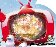| Смотрю, в предновогодние дни стали появляться салатики, приготовление которых не отнимает много времени. Видимо, не одна я на пороге праздников боюсь, что стол внезапно опустеет, когда гости будут еще не настроены расходиться по домам. На такой экстренный случай в моем холодильнике всегда припасены некоторые продукты, из которых можно сделать салат "по-быстренькому". |