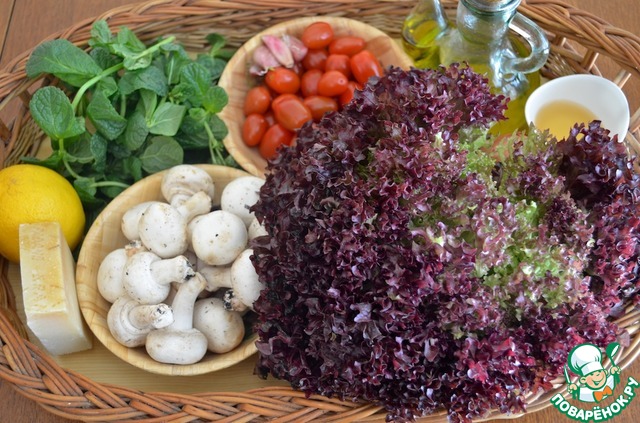 7. Разложить листья салата в тарелки, сверху выложить кольца лука, половинки помидоров и маринованные грибы. Посолить и поперчить по вкусу. Полить маринадом от грибов. Сверху посыпать небольшим количеством тертого сыра Пармезан и подавать.