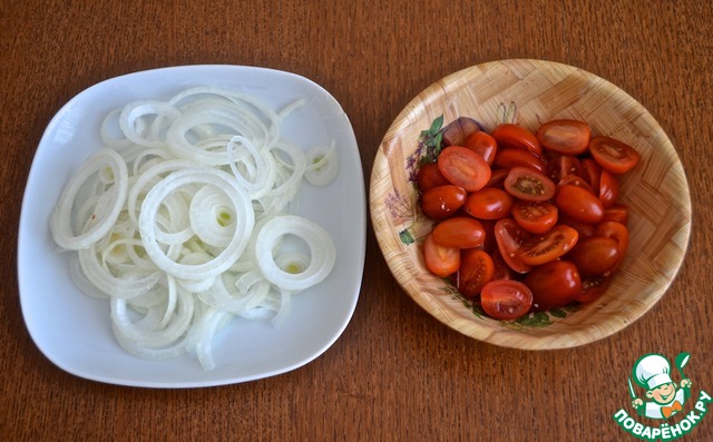 6. Помидоры-черри разрезать пополам, лук порезать тонкими кольцами. Листья салата хорошенько промыть и высушить. Сыр потереть на мелкой терке.