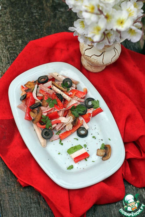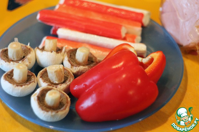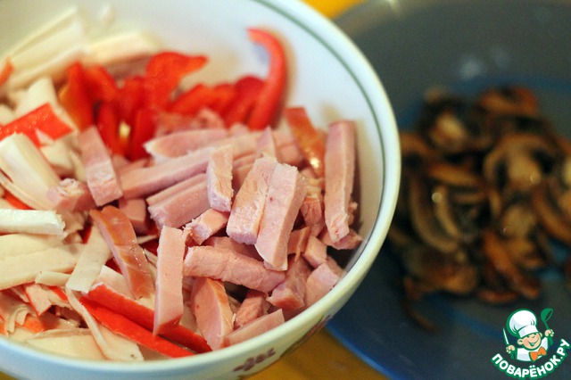 Грибы нарезать пластинами и обжарить до золотистого цвета. Снять со сковороды и остудить. Крабовые палочки, ветчину и перец нужно нарезать соломкой.