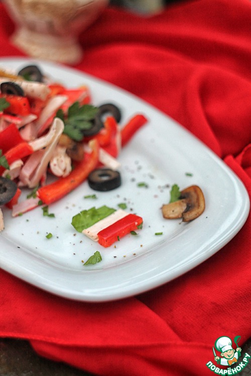 Выложить салат на порционную тарелку, украсить грибами, нарезанными кольцами маслинами и зеленью.