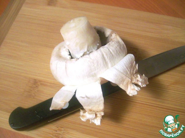Шампиньоны вымыть, отделить ножки (они не нужны), снять ножом тонкую белую кожицу со шляпок.