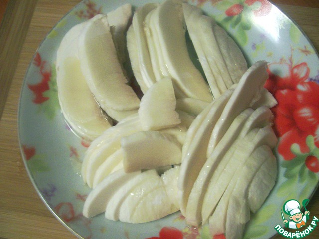 Нарезать очищенные шляпки очень тонкими ломтиками, сбрызнуть их оливковым маслом и на время отставить в сторону.