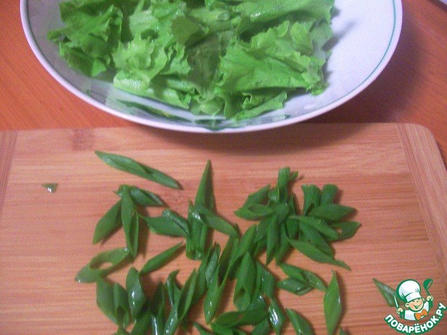 Зелень салата порвать руками на довольно крупные кусочки. Лук нарезать перышками, укроп нарезать очень мелко.
