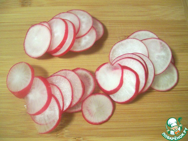 Редиску нарезать тонкими кружочками.