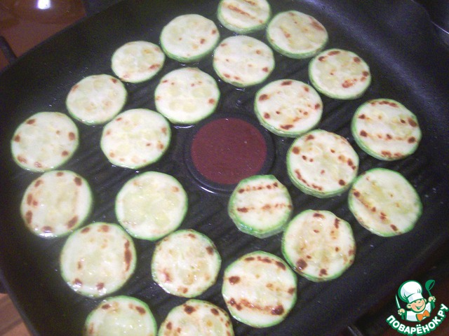Кабачок нарезать кружочками и быстро обжарить на сковороде гриль с двух сторон. Когда уже перевернете на вторую сторону, немного присолить. Чуть-чуть остудить на тарелке.