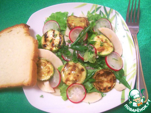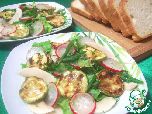 Выложить на порционные тарелки смесь салата с редисом, затем шампиньоны и кабачки. Полить заправкой. И с удовольствием скушать с домашним белым хлебушком!