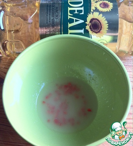 Для заправки смешать подсолнечное масло, сок лимона и мелко нашинкованный перец чили. Посолить по вкусу.