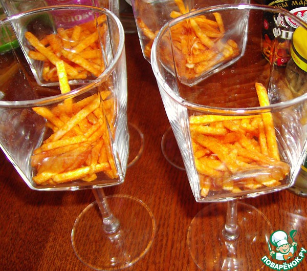 | Если нет картофельной соломки, то можно самим приготовить очень тоненькие картофель-фри. |