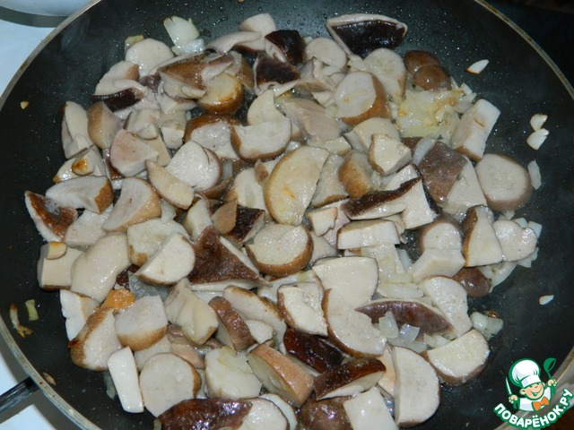 Обжарить грибы с луком. Пока они остывают подготовим остальные ингредиенты.