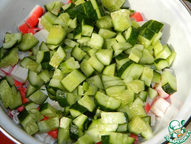 Нарезать не совсем мелко яйца и крабовые палочки.