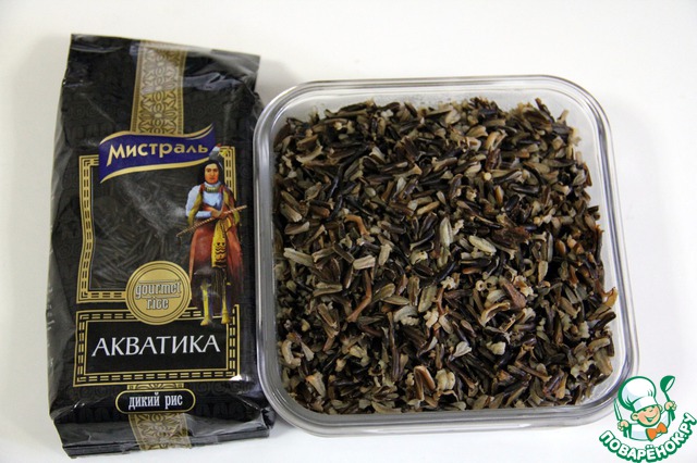 Рис можно приготовить заранее. В глубокую сковороду (я использовала вок) положить 2 столовые ложки масла, налить 3 стакана воды и довести до кипения. Положить 1 стакан дикого риса и варить при закрытой крышке 55-60 минут.
