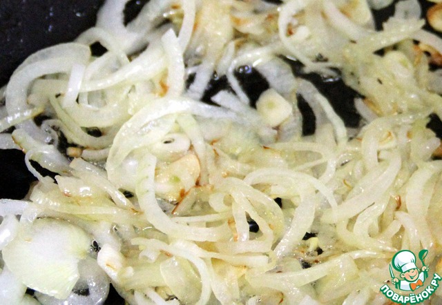 Разогреть в сковороде оливковое масло и обжарить лук и чеснок до золотистого цвета.
