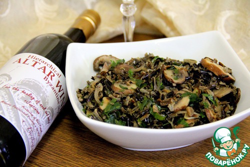 Всыпать рис и перемешать. Прогревать грибы вместе с рисом несколько минут.