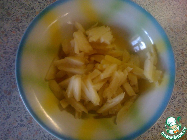 Отваренный в мундире картофель очищаем и нарезаем соломкой.